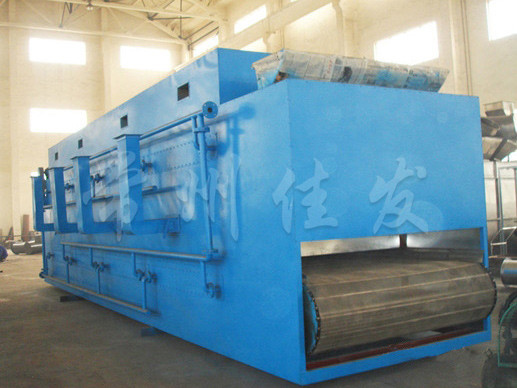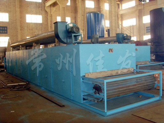 物料由加料器均勻地鋪在網(wǎng)帶上,網(wǎng)帶一般采用12-60目不銹鋼絲網(wǎng),由傳動裝置拖動在干燥機內(nèi)移動。干燥機由若干單元組成,每一單元熱風(fēng)獨立循環(huán),部分尾氣由專門濕風(fēng)機排出,廢氣由調(diào)節(jié)閥控制,熱氣由下往上或由上往下穿過鋪滿物料的網(wǎng)帶完成熱量與質(zhì)量傳遞的進程,帶走物料的水份。網(wǎng)帶緩慢移動,運行速度可根據(jù)物料溫度自動調(diào)節(jié),干燥后的成品連續(xù)落入收料器中。上下循環(huán)單元根據(jù)用戶需要可靈活配備,單元數(shù)量亦可根據(jù)需要選取。