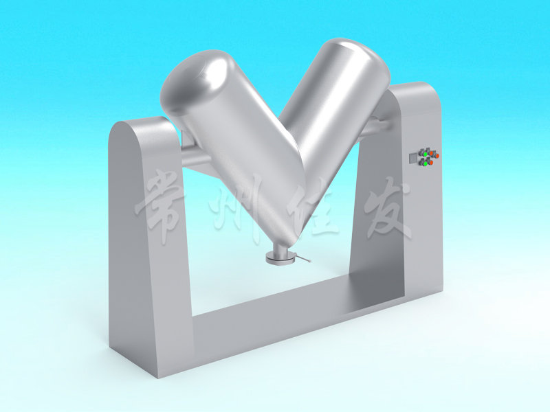 該機通過機械傳動,使不對稱的V型圓柱體內(nèi)的物料做往復(fù)翻動,達到均勻混合之目的。